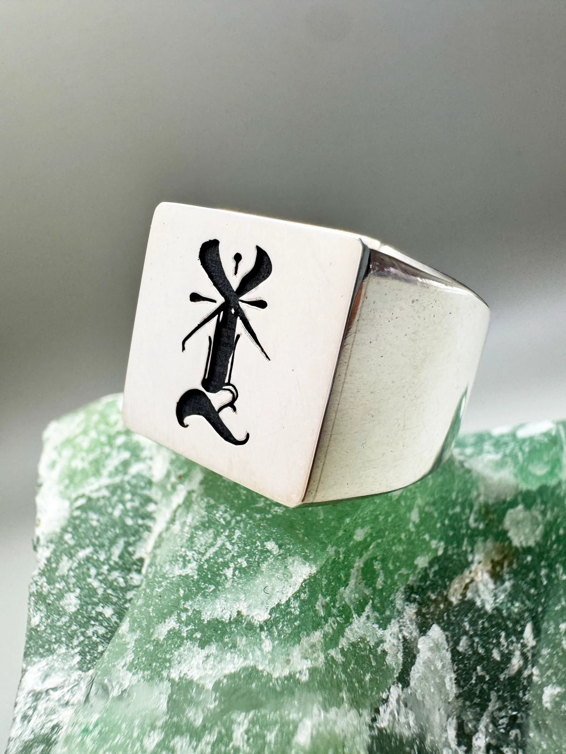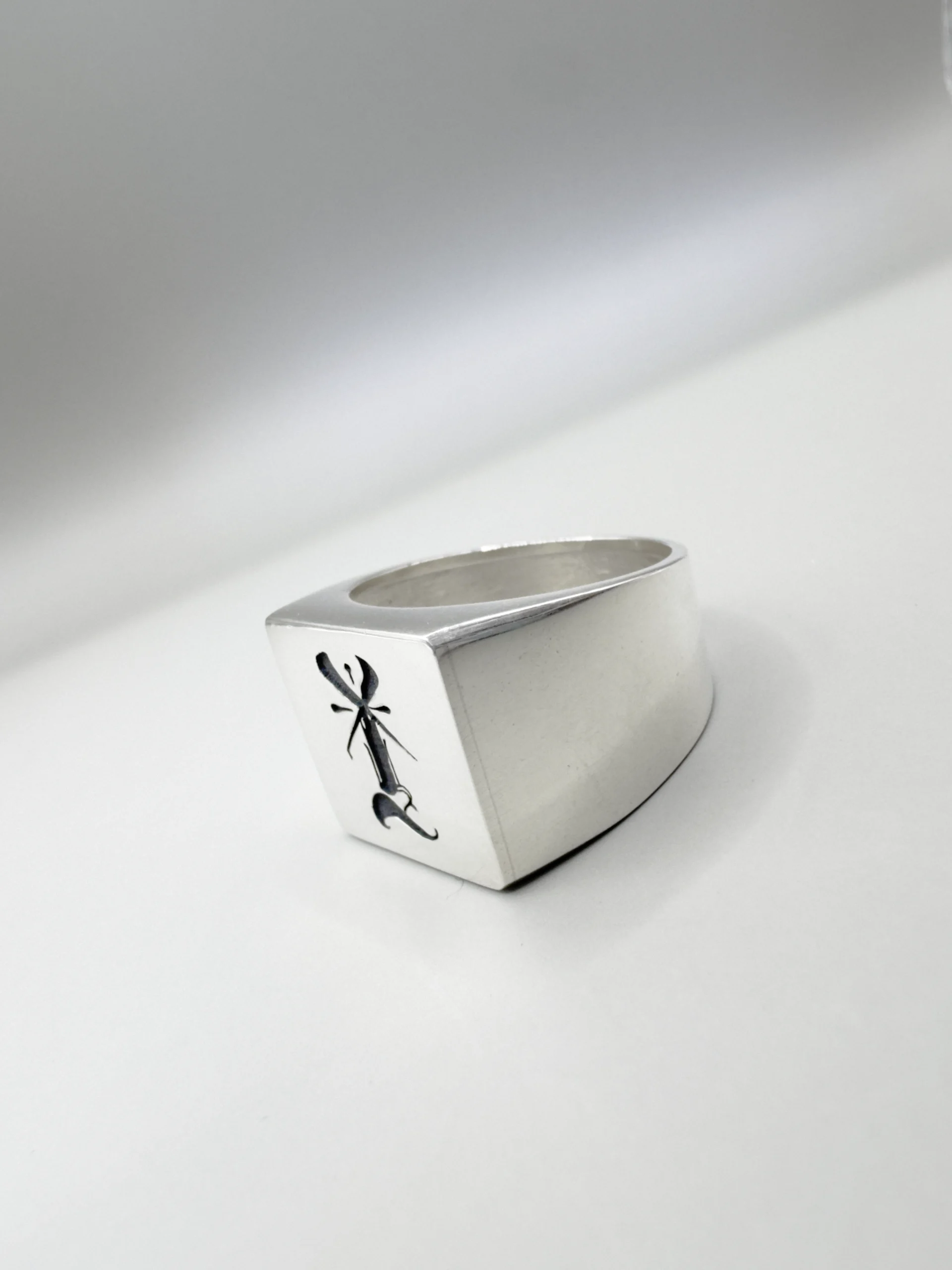 O Anel Irreverent 001 é forjado em Prata 950 legítima, garantindo um brilho superior e maior pureza que a prata comercial padrão. Com design geométrico quadrado, é uma joia de alto valor agregado que une durabilidade extrema à estética minimalista da marca.
